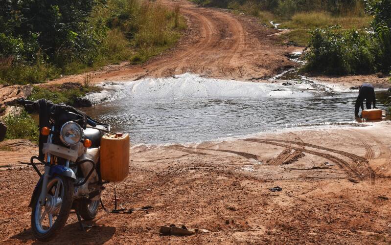Vor der Abfahrt meinte der Hotelmanager dass es eine bessere Piste gibt als die N24. Nachdem er mir den Weg beschrieben hatte fuhr ich guter Dinge los. Vorab, es gab kurze Abschnitte die besser waren. Konnte tw bis 30 KM/h fahren. Da die Piste manchmal nicht zu erkennen war, sich mehrmals teilte und ich auch niemand fragen konnte landete ich irgendwann im Busch und es ging nicht weiter. Auf der Karte war die Straße nicht eingezeichnet und das GPS fand mich nicht. Also zurück und irgendwann eine relativ breite Piste gefunden.