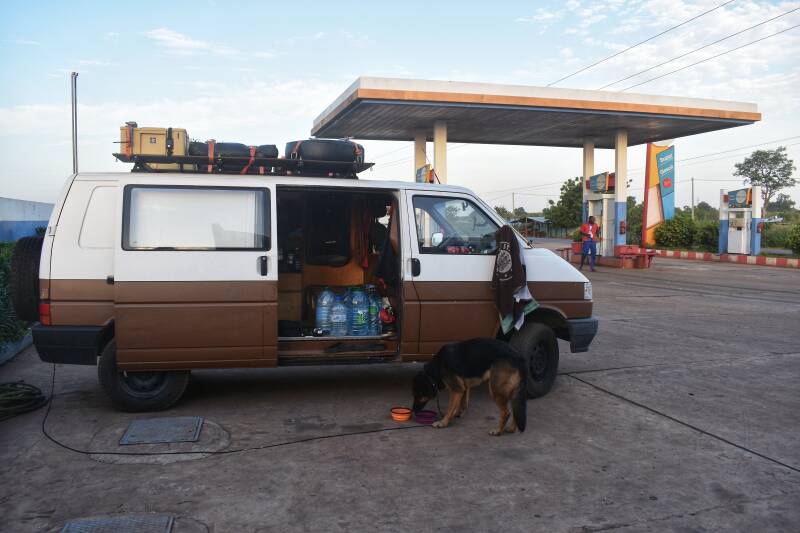 hab bei einer Tankstelle gefragt ob ich übernachten darf und Alvin den Tankwart kennengelernt. Alvin spricht etwas englisch und war super liebenswürdig. Durfte Klo und Dusche benutzen und er versicherte mir, dass die Security in der Nacht auf uns aufpassen wird. Am Morgen brachte er mir gratis Kaffee. Hatten eine Box draußen stehen wo ziemlich lang senegalesischer Hip Hop lief. Die Tanke ist so was wie ein Jugendtreff, am Abend kamen immer mehr Kids, war sehr amüsant:).