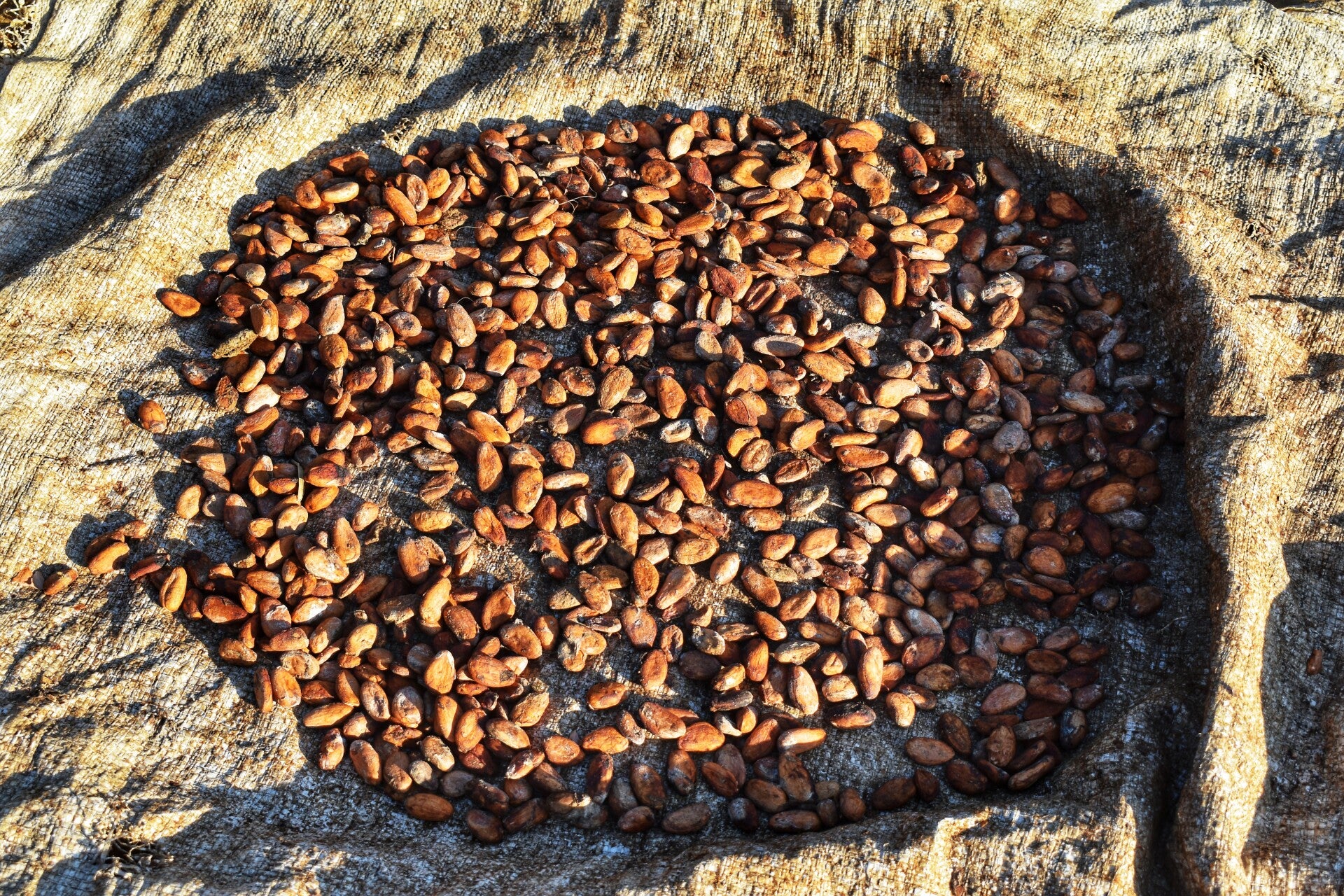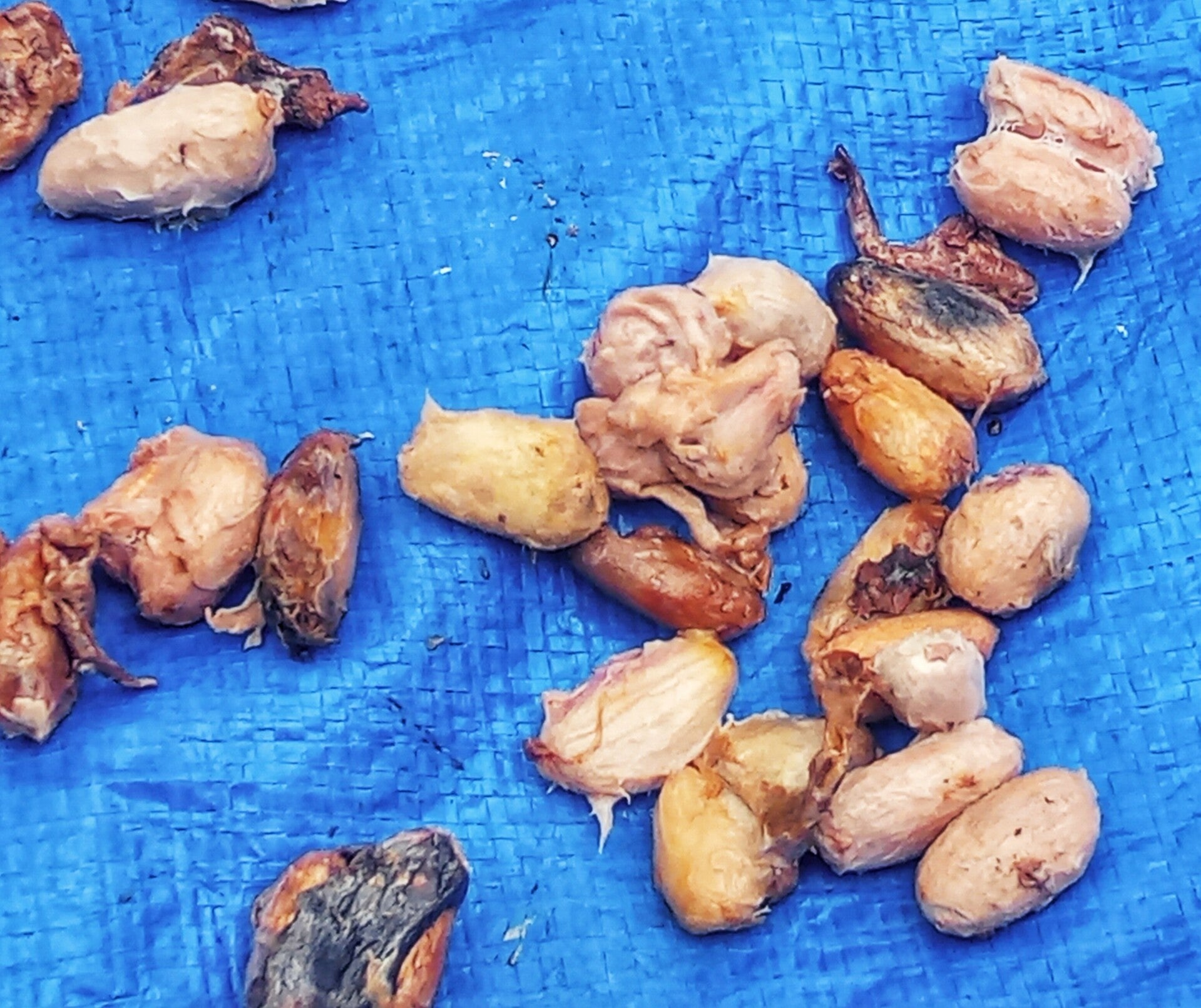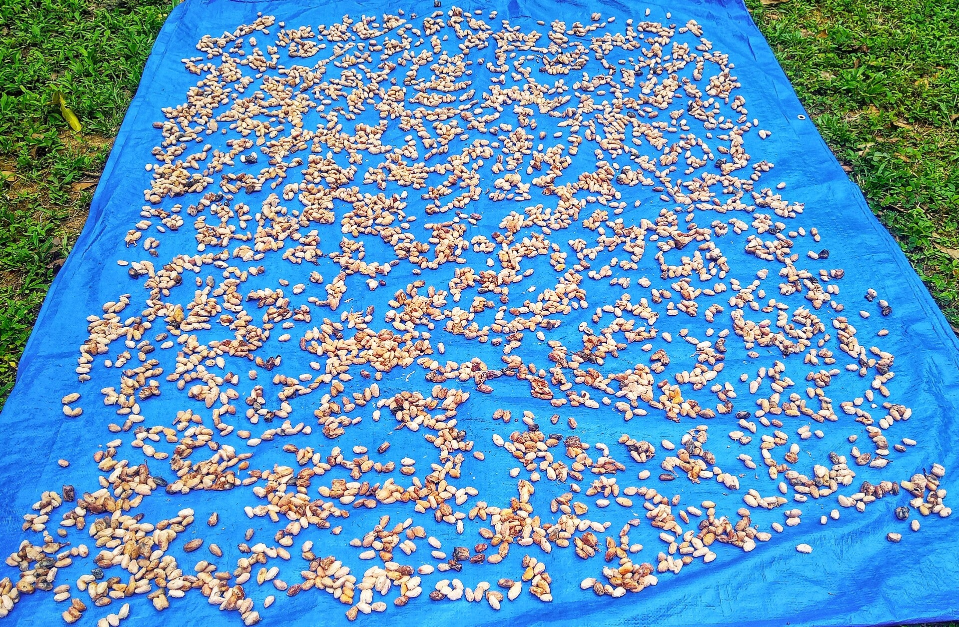 Auf den ersten 2 Fotos ist der Kakaosamen zum trocknen ausgelegt, am 3 Foto sieht man die getrockneten Bohnen.