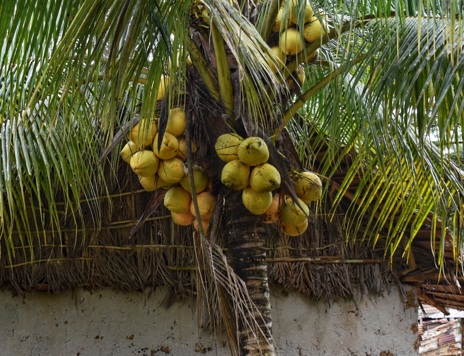 das SAO Guesthouse bietet einen Stellplatz unter einer Kokospalme mit fast reifen Früchten, Grubentoilette und Eimerdusche.