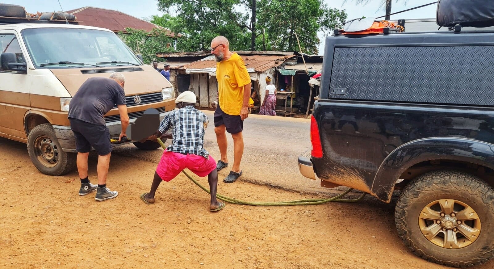 Dann die wirklich schlechte Nachricht, ein Teil davon kann nicht repariert werden. Also woher das Ersatzteil nehmen. Nach einer Stunde kommt der Motorradfahrer mit einer gebrauchten Antriebswell daher, haben die tatsächlich mal einen alten T4 am Rande des Dschungels ausgeschlachtet.