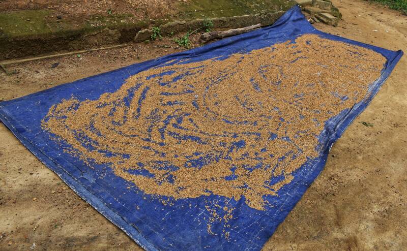 Hauptnahrungsmittel ist Reis den sie selbst anbauen, erstes Foto nach der Ernte. Am zweiten ist er zum trocknen ausgebreitet.