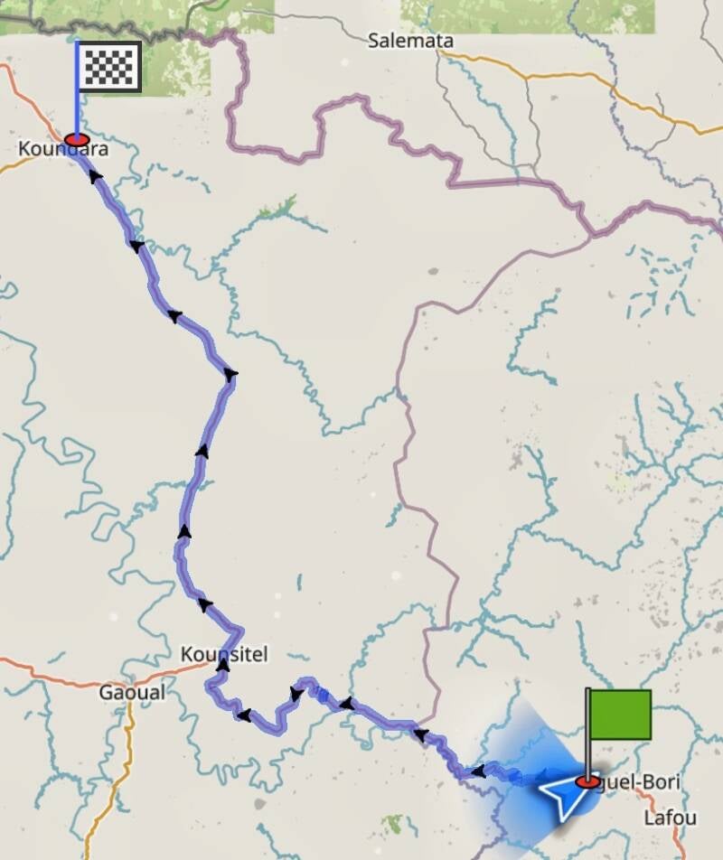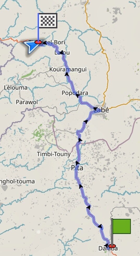 Vor uns eine riesige Tankwagenkolonne, insgesamt sicher mehr als 50 Fahrzeuge. Da die teilweise in der Mitte fahren wegen der Schlaglöcher die es auch hier gab, aber vor allem weil sie zu viert oder fünft so knapp aneinander fuhren dass man sie nur Gesamt überholen kann sehr mühsam und nicht ungefährlich. Bei den vielen Steigungen wo sie nicht schneller als 30 KM/h waren war dahinter bleiben aber auch keine Option. Also runter schalten, Gas geben und hoffen dass es keinen Gegenverkehr gibt. Immerhin scheint wieder Sprit im Land verteilt werden was beruhigend ist da jetzt bereits beide Ersatzkannis im Tank waren und ich ziemlich sicher bin dass es nicht bis Senegal reicht. Wie bereits gestern, keine einzige Kontrolle.