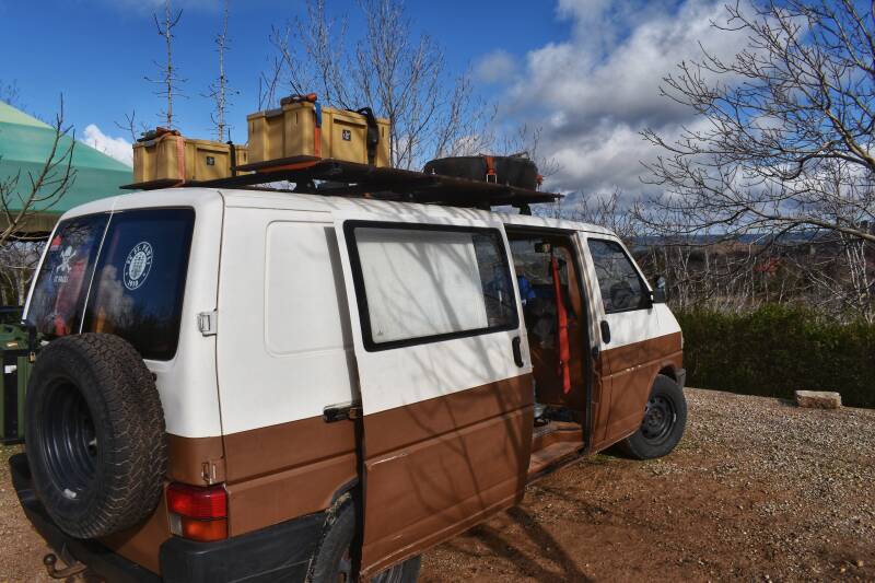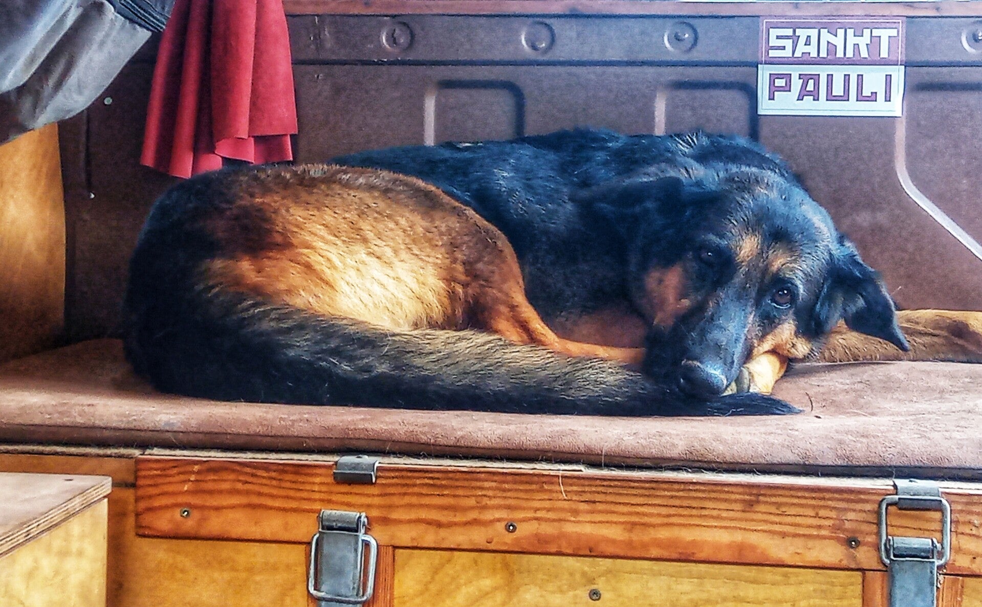 Es ist das erste mal seit 7 Monaten dass ich Schietwetter erlebe. Der Wagen wackelt im Wind, es ist grau und es nieselt. Ist aber ganz gemütlich, selbst Mitzi findet Gefallem am chillen.