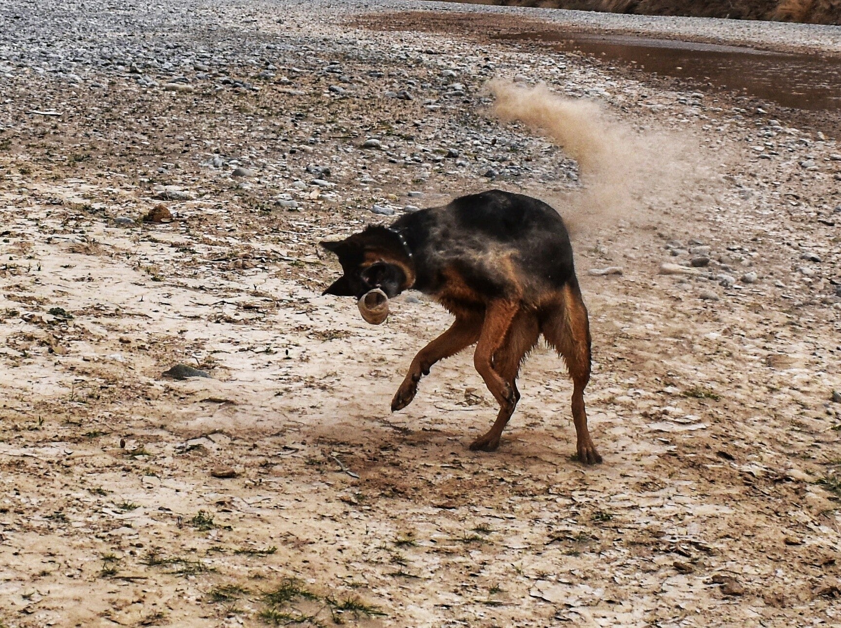 Immerhin sorgte sie selbst mit viel Bewegung dafür schneller zu trocknen. Wenn keine Stöcke rum liegen tut's auch eine alte Flasche.